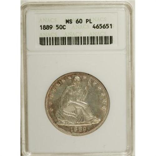 <B>1889 50C MS60 Prooflike ANACS.</B></I> Solidly struck with moderate reflectivity evident in the lightly toned fields. Areas of gold, rose, and plum color grace the margins of this piece, which has fewer marks than the MS60 grade might suggest. Housed in a pre-Amos Press ANACS holder.<BR><BR><b>Shipping:</b> Coins & Currency (<a target="_blank" href="http://www.heritageauctions.com/common/shipping.php">view shipping information</a>)