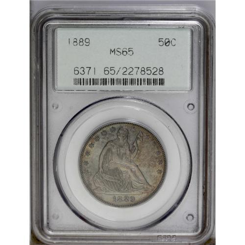 <B>1889<50C> MS65 PCGS.</B></I> Deep gray-green color mixes with subtle golden and rose shades over each side of this barely marked Gem specimen. A sharply defined example of this low mintage (12,000 business strikes) issue. Population: 18 in 65, 11 finer (3/06). <BR><BR><B>Important notice:</B> Heritage usually auctions material at the rate of 200-250 lots per hour. On some occasions eBay Live bid software or the Internet may not be able to keep up with the pace of the auction. We recommend placing a realistic absentee bid now as insurance to avoid disappointment. Occasionally the auctioneer may eliminate or reject an eBay Live bid, and the auctioneer may also reopen a lot after the close of the eBay live bidding (usually because we missed an audience bid), and may reject your bid even if it shows you as the winning bidder. By bidding via eBay Live, you agree that Heritage may award the lot to another bidder at its sole discretion under the circumstances described above or any other reasonable circumstances. Since eBay bids are not shown to us until we open the lot on the floor, we treat those bids just like floor bids. In most cases the floor responds before the eBay bid is presented to us, due to Internet lag time, so for consistency we have made it a policy that floor bids are always considered first over tie eBay live bids. Also please note that all Heritage lots purchased through eBay Live carry a 20% Buyer's Premium. Please make sure you read the Terms and Conditions before you bid. This lot is being auctioned in conjunction with a live floor auction by Heritage Galleries & Auctioneers. All final auction and invoice information will be supplied by Heritage Galleries & Auctioneers, and all other information should be considered preliminary. Lot:2027 <BR><BR><B>Winning Notification and Billing:</B> After the FINAL session in this auction is complete, Heritage will send e-mail and snail mail invoices. This process normally takes several days. All final auction and invoice information will be supplied by Heritage Galleries & Auctioneers, and all other information should be considered preliminary. <BR><BR>This auction will be conducted on a live auction floor and over the Internet through eBay Live. If you choose to place an absentee bid, please take a moment to <font color='#0000ff'><u><a href='http://pages.ebay.com/liveauctions/help/before/laabsentee.html'>learn how eBay Live absentee bidding works</a></u></font><font color='#000000'>