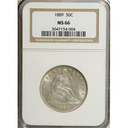 <B>1889 50C MS66 NGC.</B></I> The 1889 half dollar comes with a sparse mintage of 12,000 pieces. The low-production rates for the 1880s half dollars is alluded to by Randy Wiley and Bill Bugert (1993): "The low mintages are no doubt due to the implementation of the Bland-Allison Act of 1878 which required mints to purchase vast amounts of silver bullion and produce large quantities of silver (Morgan) dollars." This Premium Gem displays pleasing satiny luster, and just the faintest hint of tan-gold color visible under high magnification. Exquisitely struck, with no mentionable marks. Census: 9 in 66, 0 finer (6/07).<BR><BR><b>Shipping:</b> Coins & Currency (<a target="_blank" href="http://www.heritageauctions.com/common/shipping.php">view shipping information</a>)