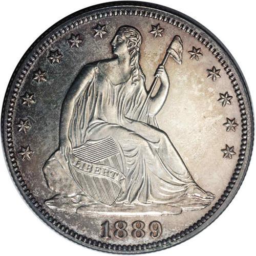 <B>1889<50C>--Obverse Improperly Cleaned--NCS. Proof.</B></I> A curved swatch of delicate hairlines on the right obverse field are strictly assessed by NCS. Medium golden-brown and mauve-wine hues converge upon the essentially brilliant devices. A mere 711 proofs were coined, along with 12,000 business strikes.