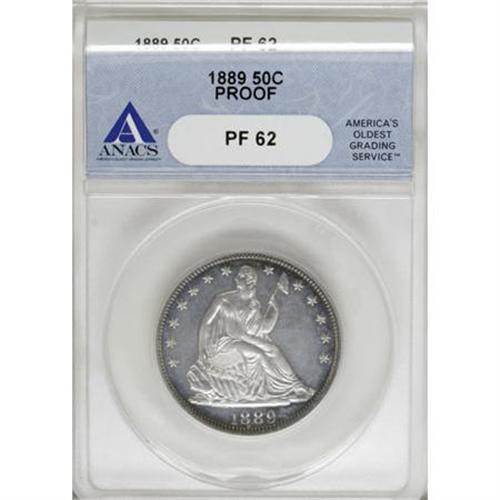 <B>1889 50C PR62 ANACS.</B></I> A pleasing light gray proof with darker peripheral toning. Both sides exhibit splendid mirrors around frosty devices. The fields are lightly hairlined, preventing a higher grade.<BR><BR><B>Coin Engraver:</B> Christian Gobrecht<BR><BR><b>Shipping:</b> Coins & Currency (<a target="_blank" href="http://www.heritageauctions.com/common/shipping.php">view shipping information</a>)