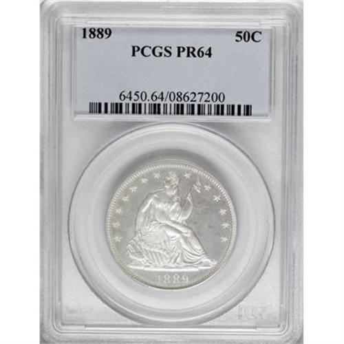 <B>1889 50C PR64 PCGS.</B></I> Bright proof surfaces yield a degree of field-motif contrast, and are essentially untoned. Sharply struck, with just a few minute marks that limit the grade. Population: 42 in 64, 24 finer (12/07).<BR><BR><B>Coin Engraver:</B> Christian Gobrecht<BR><BR><b>Shipping:</b> Coins & Currency (<a target="_blank" href="http://www.heritageauctions.com/common/shipping.php">view shipping information</a>)