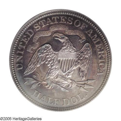 <B>1889<50C> PR66 PCGS.</B></I> The obverse exhibits ocean-blue, ruby-red, and gold colors, while the obverse is bathed in similar but more pronounced hues. Well struck, with crisp if not absolute definition on the left (facing) claw. Splendidly preserved, and a delightful addition to a cabinet of toned 19th century proofs. A scarce date with 711 proofs and 12,000 business strikes issued. Population: 9 in 66, 3 finer (11/05).