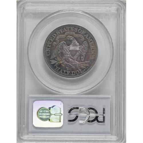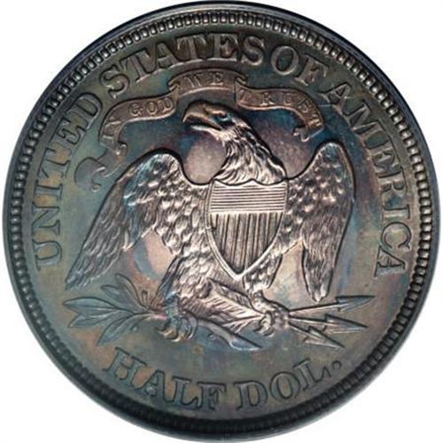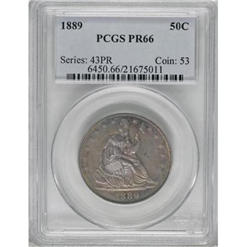 <B>1889 50C PR66 PCGS.</B></I> The obverse exhibits ocean-blue, ruby-red, and gold colors, while the obverse is bathed in similar but more pronounced hues. Well struck, with crisp if not absolute definition on the left (facing) claw. Splendidly preserved, and a delightful addition to a cabinet of toned 19th century proofs. A scarce date with 711 proofs and 12,000 business strikes issued. Population: 10 in 66, 3 finer (11/07). <BR><I>From The Kallenberg #1 PCGS Registry Set Of Proof Half Dollars.</B></I><BR><BR><B>Coin Engraver:</B> Christian Gobrecht<BR><BR><b>Shipping:</b> Coins & Currency (<a target="_blank" href="http://www.heritageauctions.com/common/shipping.php">view shipping information</a>)