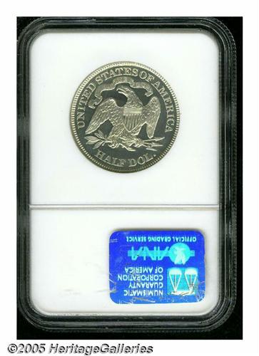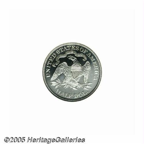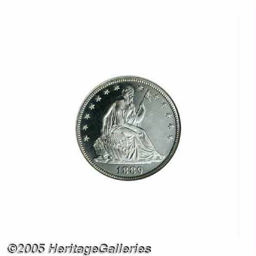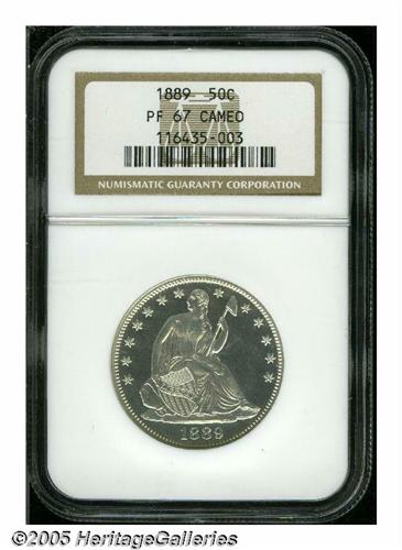 <B>1889<50C> PR67 Cameo NGC.</B></I> Untoned, silver-white features are well frosted over the devices and deeply mirrored in the fields. The surfaces are silent on the subject of distracting abrasions--a feature that confirms the validity of the PR67 designation. Virtually all major features are sharply struck, although we do note some incompleteness of reverse detail on the motto IN GOD WE TRUST that appears to be the result of a partially filled die. Produced at the end of the Seated Half Dollar series, the 1889 has a limited original mintage of 12,000 business strikes and 711 proofs. Population: 2 in 67 Cameo, 0 finer (6/05).
