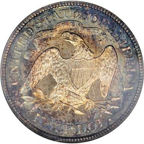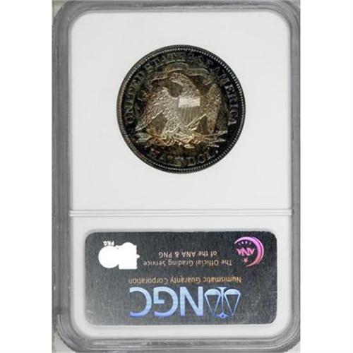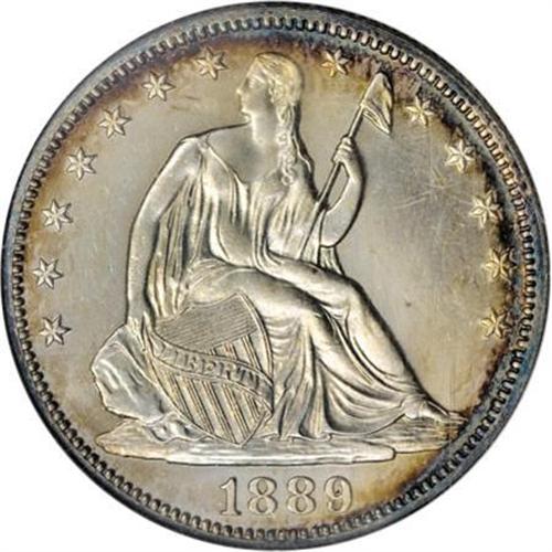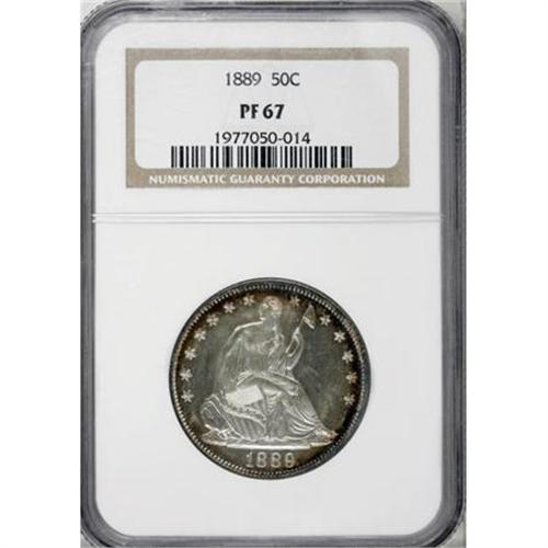 <B>1889 50C PR67 NGC.</B></I> Both sides display notable peripheral toning in rich golden, aquamarine, and maroon tones that are a bit more dramatic on the reverse. The strike is bold and the devices exhibit some light frosting, contrasting nicely with reflective fields. A scarce date with 12,000 business strikes and just 711 proofs, of which no example has been graded finer than this one. Census: 8 in 67, 0 finer (12/07).<BR><BR><B>Coin Engraver:</B> Christian Gobrecht<BR><BR><b>Shipping:</b> Coins & Currency (<a target="_blank" href="http://www.heritageauctions.com/common/shipping.php">view shipping information</a>)