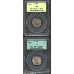 1889 5C MS64 PCGS, boldly defined throughout with rich tonal qualities over each side; and an 1892 M