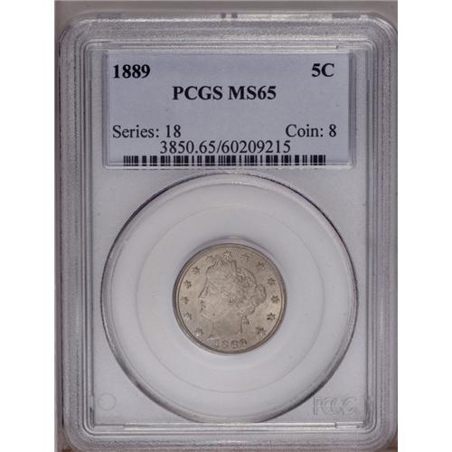 <B>1889 5C MS65 PCGS.</B></I> A frosty Gem with bright nickel surfaces beneath thinly veiled champagne toning. A splendid example, and nearly at the top of the population data. Population: 58 in 65, 8 finer (1/06).