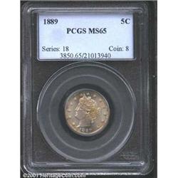 1889 5C MS65 PCGS.  Lavender and gold patina alternates on this lovely Gem. Very lustrous for a Nickel, with a good strike and an especially pristine reverse. Population: 36 in 65, 2 finer (11/01).From the Ric Leichtung Collection.  Important notice: We expect to be auctioning lots at the rate of 200-250 per hour. Sometimes eBay Premier live bid software cannot keep up with that pace, so we strongly recommend that you place a realistic proxy bid now as insurance to avoid disappointment. Also please note that all Heritage/CAA lots purchased through eBay Premier carry a 20% Buyer's Premium.