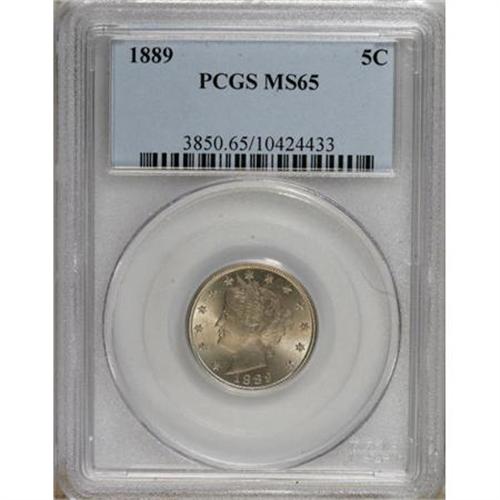 <B>1889 5C MS65 PCGS.</B></I> Sharply struck, the surfaces display just the slightest overlay of pale gray-rose-lilac toning. Excellent luster.<BR><BR><b>Shipping:</b> Coins & Currency (<a target="_blank" href="http://www.heritageauctions.com/common/shipping.php">view shipping information</a>)