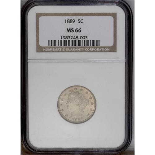 <B>1889 5C MS66 NGC.</B></I> Pleasing light gray patination bathes lustrous surfaces that are devoid of mentionable marks. The design features are well brought up. Census: 41 in 66, 3 finer (1/06).