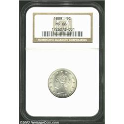 <TABLE cellSpacing=0 cellPadding=0 width="100%" bgColor=#000000 border=0><TBODY><TR><TD width="100%"><TABLE cellSpacing=1 cellPadding=3 width="100%" border=0><TBODY><TR><TD width="100%" bgColor=#79735c><FONT face=arial color=#ffffff size=3><B>Description</B> </FONT></TD></TR><TR><TD width="100%" bgColor=#ffffff><FONT face=arial size=2><B>1889 5C MS66 NGC.</B></I> Both sides of this coin are richly frosted with a bright, silver-white sheen that is devoid of mentionable toning. As befits the grade, the surfaces are essentially blemish-free with a sharp strike. An obviously important coin for the Liberty Nickel Registry Set collector, and one of two such examples being offered in this sale. Population: 38 in 66, 2 finer (7/03). </FONT></TD></TR></TBODY></TABLE></TD></TR></TBODY></TABLE><BR><A name=PricesRealized></A><TABLE cellSpacing=0 cellPadding=0 width="100%" bgColor=#000000 border=0><TBODY><TR><TD width="100%"><TABLE cellSpacing=1 cellPadding=3 width="100%" border=0><TBODY><TR><TD width="100%" bgColor=#79735c><A name=PR><FONT face=arial color=#ffffff size=3><B>Previous Prices from Heritage Auctions</B> </FONT></A></TD></TR><TR><TD bgColor=#f6f6ed><TABLE cellSpacing=0 cellPadding=0 width="100%" border=1><TBODY><TR><TD align=middle width="33%"><B>Date</B></TD><TD align=middle width="33%"><B>Service</B></TD><TD align=middle width="33%"><B>Price</B></TD></TR><TR bgColor=whitesmoke><TD width="33%"><B>11/23/2002</B></TD><TD width="33%">PCGS</TD><TD width="33%">$6,325.00</TD></TR><TR bgColor=whitesmoke><TD width="33%"><B>08/13/1999</B></TD><TD width="33%">PCGS</TD><TD width="33%">$1,408.75</TD></TR><TR bgColor=whitesmoke><TD width="33%"><B>05/31/2003</B></TD><TD width="33%">NGC</TD><TD width="33%">$1,495.00</TD></TR><TR bgColor=whitesmoke><TD width="33%"><B>07/30/2002</B></TD><TD width="33%">NGC</TD><TD width="33%">$1,006.25</TD></TR><TR bgColor=whitesmoke><TD width="33%"><B>05/21/2002</B></TD><TD width="33%">NGC</TD><TD width="33%">$1,006.25</TD></TR><TR bgColor=whitesmoke><TD width="33%"><B>08/07/2000</B></TD><TD width="33%">NGC</TD><TD width="33%">$833.75</TD></TR><TR bgColor=whitesmoke><TD width="33%"><B>03/04/1994</B></TD><TD width="33%">NGC</TD><TD width="33%">$781.00</TD></TR></TBODY></TABLE></TD></TR><TR><TD bgColor=#ffffff><FONT face=arial size=1 ?>PLEASE NOTE: All prices realized reflect the final hammer price PLUS the buyer's premium in auctions that charge a buyer's premium. Each item has a notation at the top of the listing indicating whether that lot included a buyer's premium. Example: A item that sells with a final hammer price of $100 and a 20% buyer's premium will display with a price realized of $120. All information listed is intended to be as accurate as possible, but errors are possible. Please use this guide carefully and inform us of any inaccuracies. </FONT></TD></TR></TBODY></TABLE></TD></TR></TBODY></TABLE><BR><TABLE cellSpacing=0 cellPadding=0 width="100%" bgColor=#000000 border=0><TBODY><TR><TD width="100%"><TABLE cellSpacing=1 cellPadding=3 width="100%" border=0><TBODY><TR><TD width="100%" bgColor=#79735c colSpan=6><FONT face=arial color=#ffffff size=3><B>Price Guide*</B> </FONT></TD></TR><TR bgColor=#f6f6ed><TD align=middle><B>Grade</B> </TD><TD align=middle><B>Coin World<BR>(Trends)</B> </TD><TD align=middle><B>Numismedia<BR>Retail</B> </TD><TD align=middle><B>Numismedia<BR>Wholesale</B> </TD><TD align=middle><B>Coin<BR>Universe</B> </TD><TD align=middle><B>Heritage<BR>Value Index</B> </TD></TR><TR bgColor=#ffffff><TD align=middle>65</TD><TD align=right>$800.00</TD><TD align=right>$600.00</TD><TD align=right>$480.00</TD><TD align=right>$750.00</TD><TD align=right>$593.38</TD></TR><TR style="FONT-WEIGHT: bold" bgColor=#cccfdd><TD align=middle>66</TD><TD align=right>$2,300.00</TD><TD align=right>---</TD><TD align=right>$1,050.00</TD><TD align=right>$1,850.00</TD><TD align=right>$1,466.67</TD></TR><TR bgColor=#ffffff><TD align=middle>67</TD><TD align=right>---</TD><TD align=right>---</TD><TD align=right>---</TD><TD align=right>---</TD><TD align=right>---</TD></TR><TR bgColor=#ffffff><TD colSpan=6><FONT size=1>*All information listed is intended to be as accurate as possible, but errors are possible. No item may be returned or refused based on this information which is provided as a service to our customers. You should contact each pricing source directly to determine the accuracy of this information. </FONT></TD></TR></TBODY></TABLE></TD></TR></TBODY></TABLE><BR><TABLE cellSpacing=0 cellPadding=0 width="100%" bgColor=#000000 border=0><TBODY><TR><TD width="100%"><TABLE cellSpacing=1 cellPadding=3 width="100%" border=0><TBODY><TR><TD width="100%" bgColor=#79735c><FONT face=arial color=#ffffff size=3><B>Population Guide</B> </FONT></TD></TR><TR bgColor=#ffffff><TD align=middle><!-- Begin Output of Population Grid--><TABLE cellSpacing=0 cellPadding=0 width="100%" border=0><TBODY><TR><TD vAlign=center><TABLE cellSpacing=0 width="100%" border=1 cellsadding="3"><TBODY><TR><TD vAlign=center><TABLE cellSpacing=0 cellPadding=3 width="100%" border=1><TBODY><TR><TD vAlign=center align=middle bgColor=#f0f1e8 colSpan=2 <CENTER><FONT face=Arial size=2><B>PCGS Pop </B></FONT><CENTER></CENTER></TD><TD vAlign=center align=middle bgColor=#f0f1e8 colSpan=2><CENTER><FONT face=Arial size=2><B>NGC Pop</B></CENTER></FONT></TD></TR><TR><TD vAlign=center><FONT face=Arial size=2>(66)</FONT> </TD><TD vAlign=center align=right><FONT face=Arial size=2>5</FONT> </TD><TD vAlign=center><FONT face=Arial size=2>(66)</FONT> </TD><TD vAlign=center align=right><FONT face=Arial size=2>38</FONT> </TD></TR><TR><TD vAlign=center><FONT face=Arial size=2>(>66)</FONT> </TD><TD vAlign=center align=right><FONT face=Arial size=2>0</FONT> </TD><TD vAlign=center><FONT face=Arial size=2>(>66)</FONT> </TD><TD vAlign=center align=right><FONT face=Arial size=2>2</FONT> </TD></TR></TBODY></TABLE></TD></TR></TBODY></TABLE></TD></TR></TBODY></TABLE><!-- End Output of Population Grid--> Important notice: Heritage usually