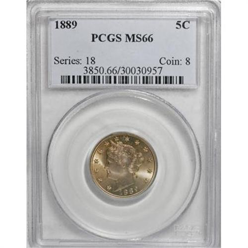 <B>1889 5C MS66 PCGS.</B></I> Ample golden-tan and yellow-orange shadings drape the surfaces of this shining Premium Gem. Pleasingly detailed at the centers, though the stars exhibit slight softness. One of just 10 MS66 pieces graded by PCGS, with none finer (3/08).<BR><BR><B>Coin Engraver:</B> Charles E. Barber<BR><BR><b>Shipping:</b> Coins & Currency (<a target="_blank" href="http://www.heritageauctions.com/common/shipping.php">view shipping information</a>)