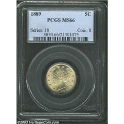 <TABLE cellSpacing=0 cellPadding=0 width="100%" bgColor=#000000 border=0><TBODY><TR><TD width="100%"><TABLE cellSpacing=1 cellPadding=3 width="100%" border=0><TBODY><TR><TD width="100%" bgColor=#79735c><FONT face=arial color=#ffffff size=3><B>Description</B> </FONT></TD></TR><TR><TD width="100%" bgColor=#ffffff><FONT face=arial size=2><B>1889 5C MS66 PCGS.</B></I> Well struck and highly lustrous, with gleaming lightly toned surfaces which only have a few slight contact marks. </FONT></TD></TR></TBODY></TABLE></TD></TR></TBODY></TABLE><BR><A name=PricesRealized></A><TABLE cellSpacing=0 cellPadding=0 width="100%" bgColor=#000000 border=0><TBODY><TR><TD width="100%"><TABLE cellSpacing=1 cellPadding=3 width="100%" border=0><TBODY><TR><TD width="100%" bgColor=#79735c><A name=PR><FONT face=arial color=#ffffff size=3><B>Previous Prices from Heritage Auctions</B> </FONT></A></TD></TR><TR><TD bgColor=#f6f6ed><TABLE cellSpacing=0 cellPadding=0 width="100%" border=1><TBODY><TR><TD align=middle width="33%"><B>Date</B></TD><TD align=middle width="33%"><B>Service</B></TD><TD align=middle width="33%"><B>Price</B></TD></TR><TR bgColor=whitesmoke><TD width="33%"><B>11/23/2002</B></TD><TD width="33%">PCGS</TD><TD width="33%">$6,325.00</TD></TR><TR bgColor=whitesmoke><TD width="33%"><B>08/13/1999</B></TD><TD width="33%">PCGS</TD><TD width="33%">$1,408.75</TD></TR><TR bgColor=whitesmoke><TD width="33%"><B>05/31/2003</B></TD><TD width="33%">NGC</TD><TD width="33%">$1,495.00</TD></TR><TR bgColor=whitesmoke><TD width="33%"><B>07/30/2002</B></TD><TD width="33%">NGC</TD><TD width="33%">$1,006.25</TD></TR><TR bgColor=whitesmoke><TD width="33%"><B>05/21/2002</B></TD><TD width="33%">NGC</TD><TD width="33%">$1,006.25</TD></TR><TR bgColor=whitesmoke><TD width="33%"><B>08/07/2000</B></TD><TD width="33%">NGC</TD><TD width="33%">$833.75</TD></TR><TR bgColor=whitesmoke><TD width="33%"><B>03/04/1994</B></TD><TD width="33%">NGC</TD><TD width="33%">$781.00</TD></TR></TBODY></TABLE></TD></TR><TR><TD bgColor=#ffffff><FONT face=arial size=1 ?>PLEASE NOTE: All prices realized reflect the final hammer price PLUS the buyer's premium in auctions that charge a buyer's premium. Each item has a notation at the top of the listing indicating whether that lot included a buyer's premium. Example: A item that sells with a final hammer price of $100 and a 20% buyer's premium will display with a price realized of $120. All information listed is intended to be as accurate as possible, but errors are possible. Please use this guide carefully and inform us of any inaccuracies. </FONT></TD></TR></TBODY></TABLE></TD></TR></TBODY></TABLE><BR><TABLE cellSpacing=0 cellPadding=0 width="100%" bgColor=#000000 border=0><TBODY><TR><TD width="100%"><TABLE cellSpacing=1 cellPadding=3 width="100%" border=0><TBODY><TR><TD width="100%" bgColor=#79735c colSpan=6><FONT face=arial color=#ffffff size=3><B>Price Guide*</B> </FONT></TD></TR><TR bgColor=#f6f6ed><TD align=middle><B>Grade</B> </TD><TD align=middle><B>Coin World<BR>(Trends)</B> </TD><TD align=middle><B>Numismedia<BR>Retail</B> </TD><TD align=middle><B>Numismedia<BR>Wholesale</B> </TD><TD align=middle><B>Coin<BR>Universe</B> </TD><TD align=middle><B>Heritage<BR>Value Index</B> </TD></TR><TR bgColor=#ffffff><TD align=middle>65</TD><TD align=right>$800.00</TD><TD align=right>$600.00</TD><TD align=right>$480.00</TD><TD align=right>$750.00</TD><TD align=right>$593.38</TD></TR><TR style="FONT-WEIGHT: bold" bgColor=#cccfdd><TD align=middle>66</TD><TD align=right>$2,300.00</TD><TD align=right>---</TD><TD align=right>$1,050.00</TD><TD align=right>$1,850.00</TD><TD align=right>$1,466.67</TD></TR><TR bgColor=#ffffff><TD align=middle>67</TD><TD align=right>---</TD><TD align=right>---</TD><TD align=right>---</TD><TD align=right>---</TD><TD align=right>---</TD></TR><TR bgColor=#ffffff><TD colSpan=6><FONT size=1>*All information listed is intended to be as accurate as possible, but errors are possible. No item may be returned or refused based on this information which is provided as a service to our customers. You should contact each pricing source directly to determine the accuracy of this information. </FONT></TD></TR></TBODY></TABLE></TD></TR></TBODY></TABLE><BR><TABLE cellSpacing=0 cellPadding=0 width="100%" bgColor=#000000 border=0><TBODY><TR><TD width="100%"><TABLE cellSpacing=1 cellPadding=3 width="100%" border=0><TBODY><TR><TD width="100%" bgColor=#79735c><FONT face=arial color=#ffffff size=3><B>Population Guide</B> </FONT></TD></TR><TR bgColor=#ffffff><TD align=middle><!-- Begin Output of Population Grid--><TABLE cellSpacing=0 cellPadding=0 width="100%" border=0><TBODY><TR><TD vAlign=center><TABLE cellSpacing=0 width="100%" border=1 cellsadding="3"><TBODY><TR><TD vAlign=center><TABLE cellSpacing=0 cellPadding=3 width="100%" border=1><TBODY><TR><TD vAlign=center align=middle bgColor=#f0f1e8 colSpan=2 <CENTER><FONT face=Arial size=2><B>PCGS Pop </B></FONT><CENTER></CENTER></TD><TD vAlign=center align=middle bgColor=#f0f1e8 colSpan=2><CENTER><FONT face=Arial size=2><B>NGC Pop</B></CENTER></FONT></TD></TR><TR><TD vAlign=center><FONT face=Arial size=2>(66)</FONT> </TD><TD vAlign=center align=right><FONT face=Arial size=2>5</FONT> </TD><TD vAlign=center><FONT face=Arial size=2>(66)</FONT> </TD><TD vAlign=center align=right><FONT face=Arial size=2>38</FONT> </TD></TR><TR><TD vAlign=center><FONT face=Arial size=2>(>66)</FONT> </TD><TD vAlign=center align=right><FONT face=Arial size=2>0</FONT> </TD><TD vAlign=center><FONT face=Arial size=2>(>66)</FONT> </TD><TD vAlign=center align=right><FONT face=Arial size=2>2</FONT> </TD></TR></TBODY></TABLE></TD></TR></TBODY></TABLE></TD></TR></TBODY></TABLE><!-- End Output of Population Grid--> Important notice: Heritage usually auctions material at the rate of 200-250 lots per hour. On some occasions eBay Live bid software or the Internet may not be able to keep up with the pace of the auction. We recommend placing a realistic absentee bid now as insurance to avoid disappointm