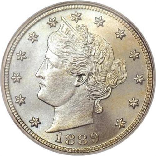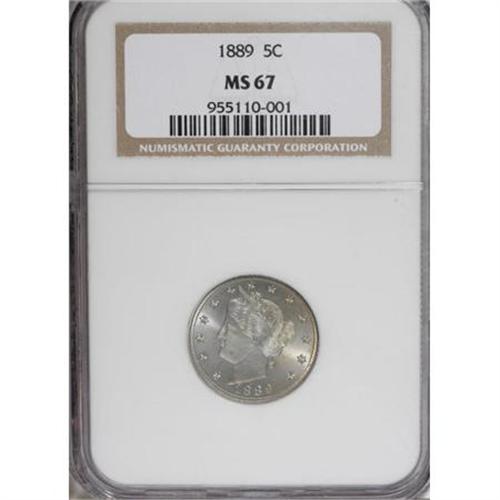 <B>1889 5C MS67 NGC.</B></I> A thoroughly lustrous Superb Gem with exquisitely dappled golden-tan and powder-blue toning. Well struck and essentially immaculate. The 1889 is available in Uncirculated condition, but examples with the present formidable quality are very rare. Heritage has not offered an MS67 1889 since 1996. Census: 3 in 67, 0 finer (6/07).<BR><BR><B>Coin Engraver:</B> Charles E. Barber<BR><BR><b>Shipping:</b> Coins & Currency (<a target="_blank" href="http://www.heritageauctions.com/common/shipping.php">view shipping information</a>\)