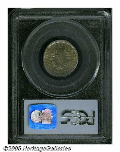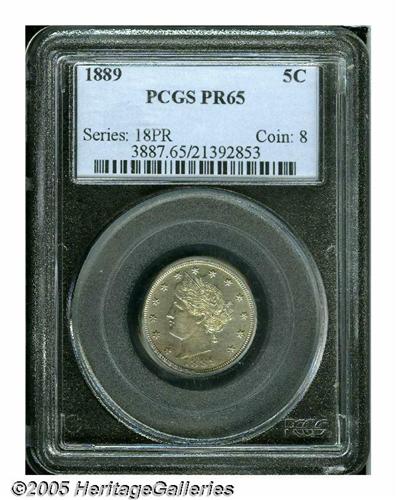 <B>1889<5C> PR65 PCGS.</B></I> Proof surfaces are lovingly preserved on both sides, and are visited by blushes of pastel gold-brown, powder-blue, and magenta coloration. The design features are well struck, except for softness in the leaves and ear of corn to the left of the bowknot. A very attractive piece that will fit nicely into a high-grade Liberty nickel collection.