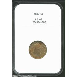 1889 5C PR66 NGC. Dappled honey-tan patina drifts over otherwise silver-gray surfaces. Both sides ar