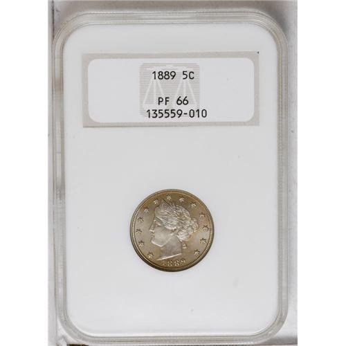 <B>1889<5C> PR66 NGC.</B></I> Peach and gunmetal-blue toning drapes this satiny and sharply struck Premium Gem. Certified in an early pre-hologram NGC holder. Census: 77 in 66, 16 finer (8/06).