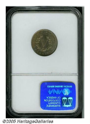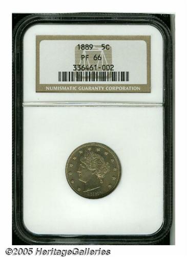 <B>1889<5C> PR66 NGC.</B></I> The design elements are sharply struck throughout, and the bright proof surfaces display a thin veneer of pastel sky-blue and gold-brown patina. A couple pf trivial marks on Liberty's neck do not distract. Population: 66 in 66, 15 finer (6/05).