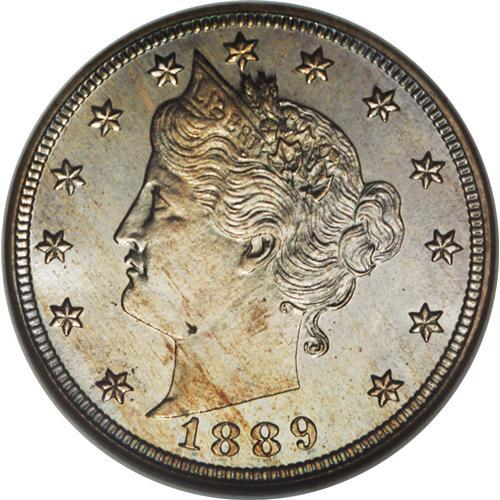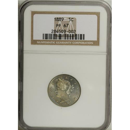 <B>1889 5C PR67 NGC.</B></I> Ice-blue at the periphery with yellow-green at the centers and occasional amber-orange accents on each side. The devices display excellent detail, and the surfaces are exceptionally well-preserved, as one would expect for the grade. Highly appealing. Census: 15 in 67, 1 finer (12/06).<BR><I>From The Paul Vine Collection.</B></I><BR><BR><b>Shipping:</b> Coin/Currency (<a target="_blank" href="http://www.heritageauctions.com/common/shipping.php">view shipping information</a>)