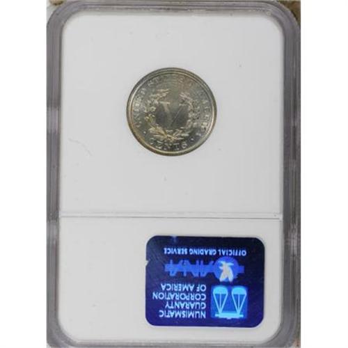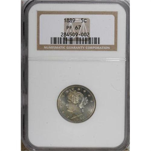 <B>1889 5C PR67 NGC.</B></I> Ice-blue at the periphery with bluish-green color at the centers and occasional amber-orange accents on each side. The devices display excellent detail, and the surfaces are exceptionally well preserved, as one would expect for the grade. Highly appealing. Census: 16 in 67, 1 finer (6/07). <BR><BR><b>Shipping:</b> Coins & Currency (<a target="_blank" href="http://www.heritageauctions.com/common/shipping.php">view shipping information</a>)