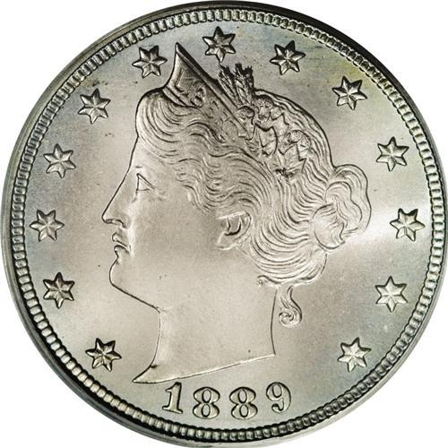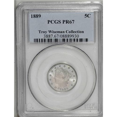 <B>1889<5C> PR67 PCGS.</B></I> Lovely blue-green and lilac patina covers each side of this stunning coin. The strike is razor-sharp, and careful scrutiny with a loupe reveals only a single, dotlike contact mark behind Liberty's hair bun. One of seven pieces so graded at PCGS, with none finer (7/06).<BR><I>From The Troy Wiseman Collection.</B></I>