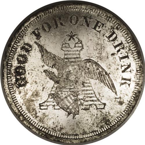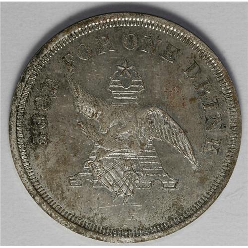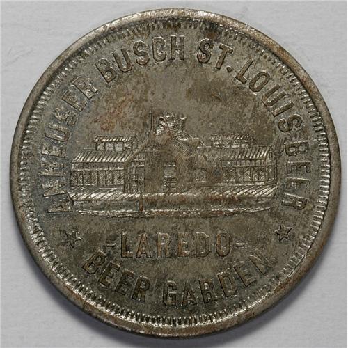<B>(1889-90) Laredo, Texas, Anheuser Busch St. Louis Beer, Laredo Beer Garden, AU.</B></I> 'Good For One Drink.' Listed on page 834 of the Rulau fourth edition. This interesting piece is struck in German silver, an unlisted metal (Rulau has this piece in aluminum) on an approximately 35mm planchet.