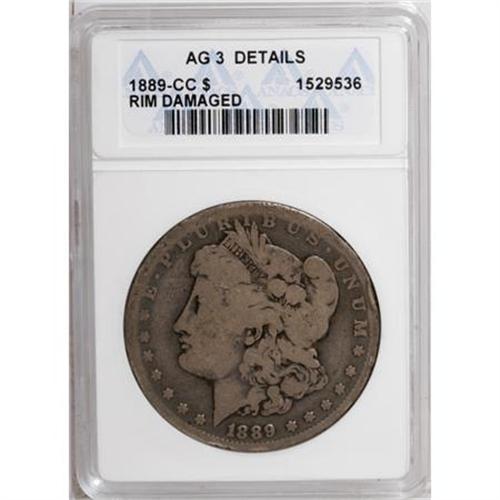 <B>1889-CC $1 --Rim Damaged--ANACS. AG3 Details.</B></I> NGC Census: (0/3283). PCGS Population (35/3143). Mintage: 350,000. Numismedia Wsl. Price for NGC/PCGS coin in AG3 : $267. (#7190)<BR><BR><B>Coin Engraver:</B> George T. Morgan<BR><BR><b>Shipping:</b> Coins & Currency (<a target="_blank" href="http://www.heritageauctions.com/common/shipping.php">view shipping information</a>\)