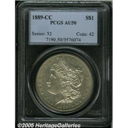 <B>1889-CC<img border='0' src='http://www.heritagecoins.com/images/star.gif' width=10 height=10>$1 AU50 PCGS.</B></I> Regardless of grade, the '89-CC Morgan Dollar is one of the most desirable coins in the entire series, and it is without a doubt the most desirable and famous of the 13 Carson City Mint issues. It is this coin that is the key to a complete collection of these popular dollars. This example has nearly full luster with light champagne toning over silvery surfaces. It is nicely struck and has only the slightest wear on the high points. The fields are lightly reflective, and when this was first struck it was certainly a wonderful prooflike example. Although probably cleaned in the past, it is not obviously so, and fully deserves its encapsulation by PCGS.