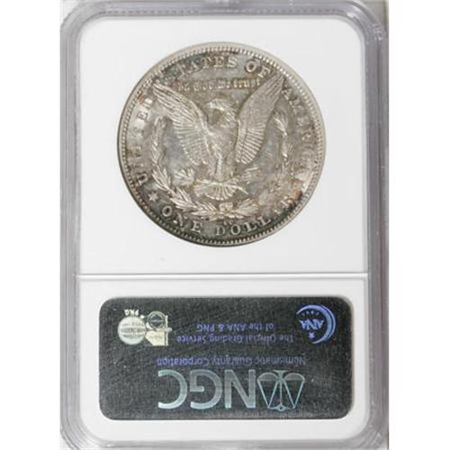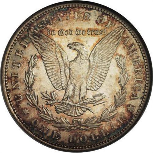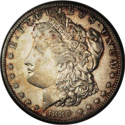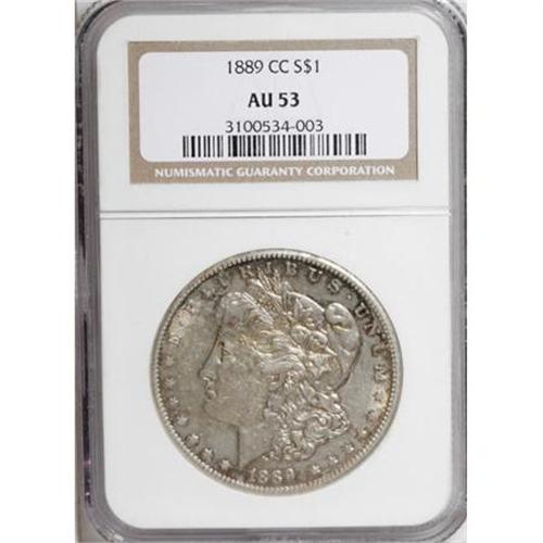 <B>1889-CC $1 AU53 NGC.</B></I> A blend of delicate silver-blue, gold, and rose-orange toning graces each side of this briefly circulated key-date Carson City dollar. Despite light wear across the well struck central devices, this piece retains the vast majority of its luster. Light, scattered abrasions are present on and near Liberty's portrait, yet the coin retains solid visual appeal.<BR><BR><B>Coin Engraver:</B> George T. Morgan<BR><BR><b>Shipping:</b> Coins & Currency (<a target="_blank" href="http://www.heritageauctions.com/common/shipping.php">view shipping information</a>)