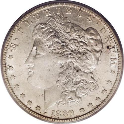 <B>1889-CC $1 AU53 PCGS.</B></I> Both sides of this piece have light champagne color over silver luster with a few specks of dark toning, primarily on the obverse. Each side has the usual minor abrasions and tiny scratches that are expected at the grade. A delightful example that is elusive in this quality.<BR><BR><B>Coin Engraver:</B> George T. Morgan<BR><BR><b>Shipping:</b> Coins & Currency (<a target="_blank" href="http://www.heritageauctions.com/common/shipping.php">view shipping information</a>)