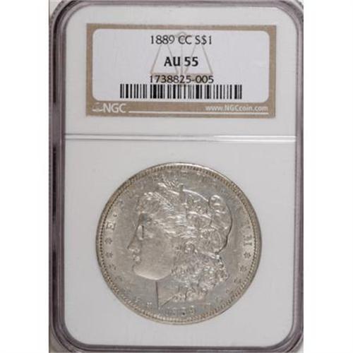<B>1889-CC $1 AU55 NGC.</B></I> A very pleasing example of this always-collectible key date. Although it exhibits evidence of a brief stint in circulation, its surfaces show no offensive marks and just some of the light friction that defines the grade. There is still a lot of luster visible and the surfaces are clean and generally untoned, save some light cinnamon toning seen near the edges on the reverse.<BR><BR><B>Coin Engraver:</B> George T. Morgan<BR><BR><b>Shipping:</b> Coins & Currency (<a target="_blank" href="http://www.heritageauctions.com/common/shipping.php">view shipping information</a>)