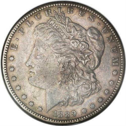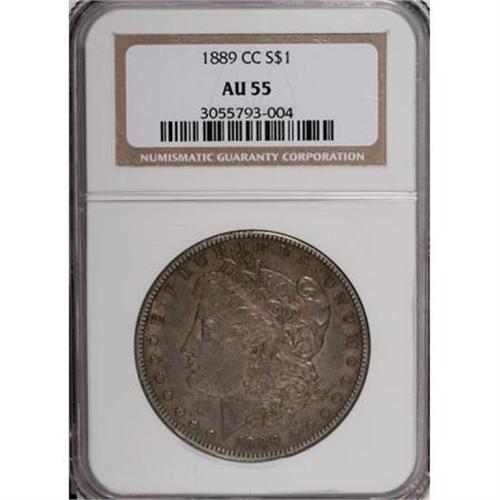 <B>1889-CC $1 AU55 NGC.</B></I> Like the 1893-S, the 1889-CC is scarce in all grades and sought after by collectors from one end of the price and grade spectrum to the other. An AU55 coin gives the collector good value without paying the price of a technical Mint State coin. This piece shows considerable remaining luster around the devices, and the central details are strongly defined. This piece is deeply toned, and the only mark of note is a diagonal one on the highpoint of Liberty's cheek.<BR><BR><B>Coin Engraver:</B> George T. Morgan<BR><BR><b>Shipping:</b> Coins & Currency (<a target="_blank" href="http://www.heritageauctions.com/common/shipping.php">view shipping information</a>)