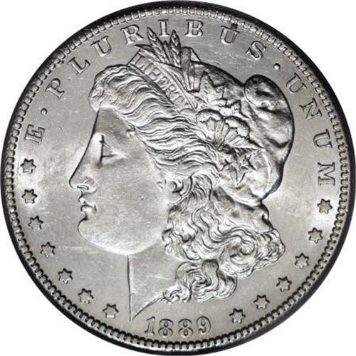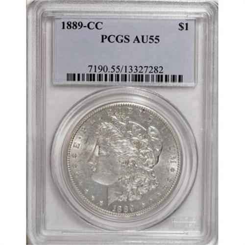 <B>1889-CC $1 AU55 PCGS.</B></I> The vast majority of 1889-CC dollars that survive today show significant wear or impairment. This silver-blue Choice AU example provides an attractive exception, with still-lustrous fields that show only scattered, wispy marks. A touch of wear is present on the highpoints of the portrait, but the overall level of detail is solid.<BR><BR><B>Coin Engraver:</B> George T. Morgan<BR><BR><b>Shipping:</b> Coins & Currency (<a target="_blank" href="http://www.heritageauctions.com/common/shipping.php">view shipping information</a>)
