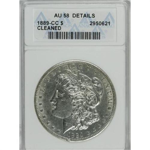 <B>1889-CC $1 --Cleaned--ANACS. AU58 Details.</B></I> This key Carson City dollar has been dipped, and each side has a few wispy hairlines, but nearly all collectors will instead notice the unbroken peripheral luster and the virtual absence of wear. The obverse has a small rim nick at 6:30.<BR><BR><B>Coin Engraver:</B> George T. Morgan<BR><BR><b>Shipping:</b> Coins & Currency (<a target="_blank" href="http://www.heritageauctions.com/common/shipping.php">view shipping information</a>)