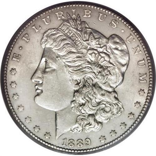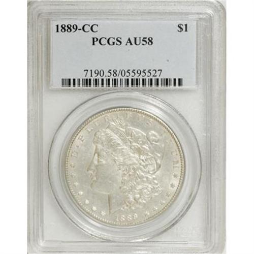 <B>1889-CC $1 AU58 PCGS.</B></I> The 1889-CC is the key to the Carson City series of dollars and also one of the five major keys to the entire Morgan dollar series. Only 350,000 pieces were struck with the majority of survivors in lower circulated grades. This piece is remarkably sharp in the centers with strong detailing on the hair over Liberty's ear as well as on the eagle's breast. A faint bit of reflectivity can be made out in the fields (mostly the reverse fields), with a significant amount of peripheral mint luster on the obverse and luster outlining all the devices on the reverse. Nearly brilliant with just a faint trace of color present on each side. An important opportunity for the dollar collector to acquire this key in uncleaned, near-Mint condition.<BR><I>From The Jimmy G. PCGS Registry Collection of Morgan Dollars with Varieties.</B></I><BR><BR><B>Coin Engraver:</B> George T. Morgan<BR><BR><b>Shipping:</b> Coins & Currency (<a target="_blank" href="http://www.heritageauctions.com/common/shipping.php">view shipping information</a>)