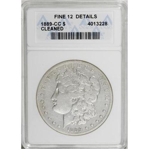 <B>1889-CC $1 --Cleaned--ANACS. Fine 12 Details.</B></I> Despite the considerable wear evident on this cloud-gray Carson City key, the lightly abraded surfaces are luminous from a past cleaning. Still, a thoroughly collectible example of this challenging issue.<BR><BR><B>Coin Engraver:</B> George T. Morgan<BR><BR><b>Shipping:</b> Coins & Currency (<a target="_blank" href="http://www.heritageauctions.com/common/shipping.php">view shipping information</a>)
