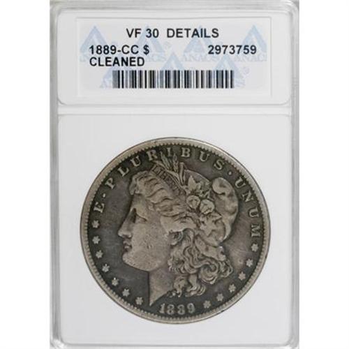 <B>1889-CC $1 --Cleaned--ANACS. VF30 Details.</B></I> A moderately worn, lightly hairlined example that displays a handful of abrasions on the cheek. The fields have predominantly deep rose-violet color, while the devices have gold-gray color of varying intensity. A desirable example of this Carson City key, one of just 350,000 pieces struck.<BR><BR><b>Shipping:</b> Coins & Currency (<a target="_blank" href="http://www.heritageauctions.com/common/shipping.php">view shipping information</a>)
