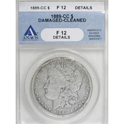 <B>1889-CC $1 --Cleaned, Damaged--ANACS Fine 12 Details.</B></I> NGC Census: (104/1967). PCGS Population (162/2775). Mintage: 350,000. Numismedia Wsl. Price for NGC/PCGS coin in F12: $775. (#7190)<BR><BR><B>Coin Engraver:</B> George T. Morgan<BR><BR><b>Shipping:</b> Coins & Currency (<a target="_blank" href="http://www.heritageauctions.com/common/shipping.php">view shipping information</a>)