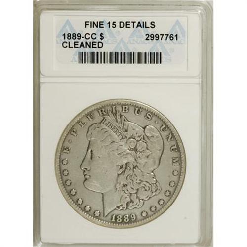 <B>1889-CC $1 --Cleaned--ANACS. Fine 15 Details.</B></I> NGC Census: (98/1784). PCGS Population (214/2435). Mintage: 350,000. Numismedia Wsl. Price for NGC/PCGS coin in F15: $1,029. (#7190)<BR><BR><B>Coin Engraver:</B> George T. Morgan<BR><BR><b>Shipping:</b> Coins & Currency (<a target="_blank" href="http://www.heritageauctions.com/common/shipping.php">view shipping information</a>\)