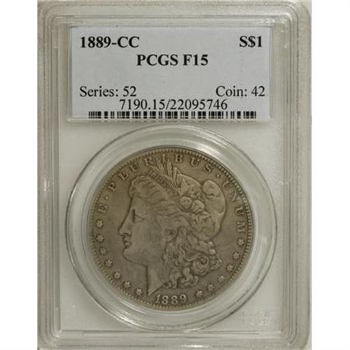 <B>1889-CC $1 F15 PCGS.</B></I> PCGS Population (214/2435). NGC Census: (98/1784). Mintage: 350,000. Numismedia Wsl. Price for NGC/PCGS coin in F15: $1,029. (#7190)<BR><BR><B>Coin Engraver:</B> George T. Morgan<BR><BR><b>Shipping:</b> Coins & Currency (<a target="_blank" href="http://www.heritageauctions.com/common/shipping.php">view shipping information</a>\)