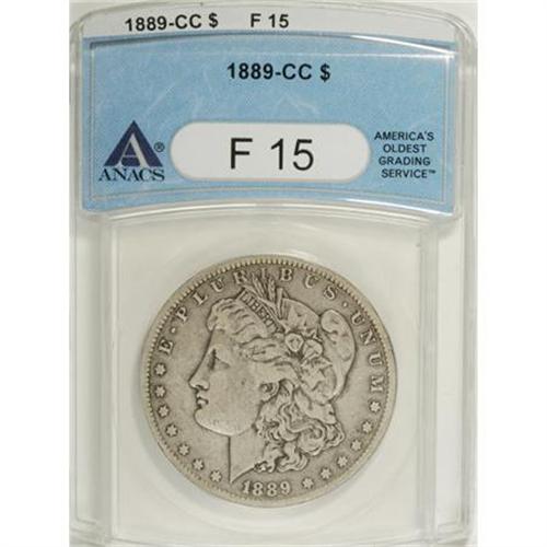 <B>1889-CC $1 Fine 15 ANACS.</B></I> A slate-gray key date Carson City dollar with glimpses of charcoal patina within design crevices. Design detail remains evident within the hair and plumage. Problem-free for the grade.<BR><BR><b>Shipping:</b> Coins & Currency (<a target="_blank" href="http://www.heritageauctions.com/common/shipping.php">view shipping information</a>)