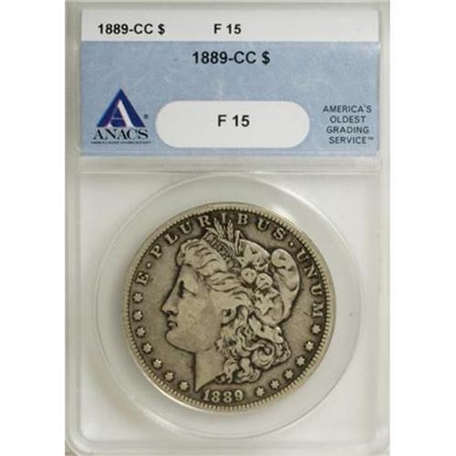 <B>1889-CC $1 Fine 15 ANACS.</B></I> Examples of this key-date are in demand in all grades from Good through Mint State. This piece, a Choice Fine, has deep gray and steel toning, with lighter tan on the devices.<BR><BR><B>Coin Engraver:</B> George T. Morgan<BR><BR><b>Shipping:</b> Coins & Currency (<a target="_blank" href="http://www.heritageauctions.com/common/shipping.php">view shipping information</a>)