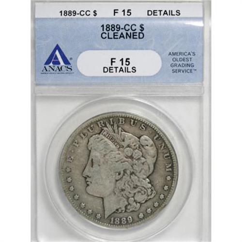 <B>1889-CC $1 --Cleaned--ANACS. Fine 15 Details.</B></I> The fields are lightly hairlined on each side, but there are no singular abrasions, and the surfaces show pleasing medium-silver coloration.<BR><I>From The John Stimson, Sr. Collection, Part Two.</B></I><BR><BR><B>Coin Engraver:</B> George T. Morgan<BR><BR><b>Shipping:</b> Coins & Currency (<a target="_blank" href="http://www.heritageauctions.com/common/shipping.php">view shipping information</a>)