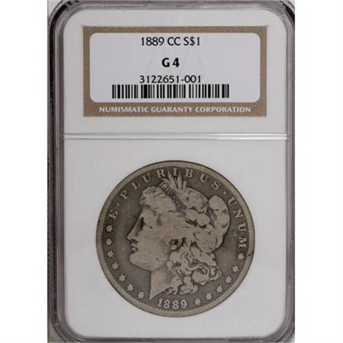 <B>1889-CC $1 G4 NGC.</B></I> . NGC Census: (22/2247). PCGS Population (64/3304). Mintage: 350,000. Numismedia Wsl. Price for NGC/PCGS coin in G4 : $430. (#7190)<BR><BR><B>Coin Engraver:</B> George T. Morgan<BR><BR><b>Shipping:</b> Coins & Currency (<a target="_blank" href="http://www.heritageauctions.com/common/shipping.php">view shipping information</a>)