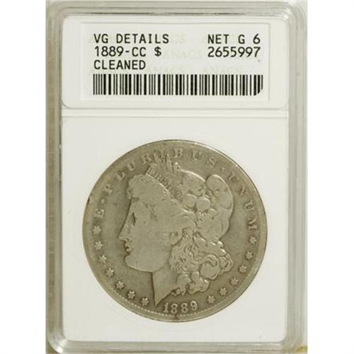 <B>1889-CC $1 --Cleaned--ANACS. VG Details, Net Good 6.</B></I> NGC Census: (51/2205). PCGS Population (104/3220). Mintage: 350,000. Numismedia Wsl. Price for NGC/PCGS coin in G6 : $479. (#7190)<BR><BR><B>Coin Engraver:</B> George T. Morgan<BR><BR><b>Shipping:</b> Coins & Currency (<a target="_blank" href="http://www.heritageauctions.com/common/shipping.php">view shipping information</a>)