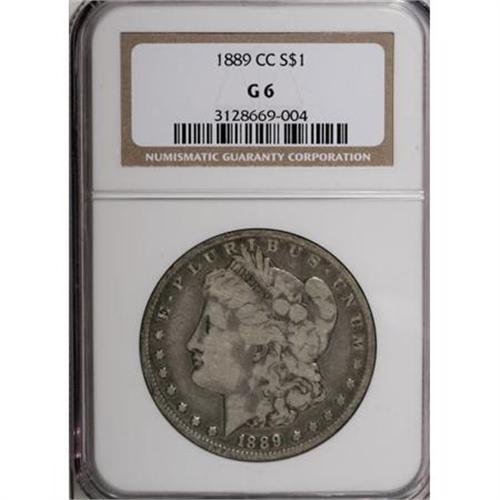 <B>1889-CC $1 Good 6 NGC.</B></I> Natural golden-gray patina bathes both sides, each of which retains excellent design detail and a minimum of marks for a heavily circulated coin. A desirable, key date even in this lower level of preservation. The new owner will be delighted with this Choice Good example.<BR><BR><B>Coin Engraver:</B> George T. Morgan<BR><BR><b>Shipping:</b> Coins & Currency (<a target="_blank" href="http://www.heritageauctions.com/common/shipping.php">view shipping information</a>)