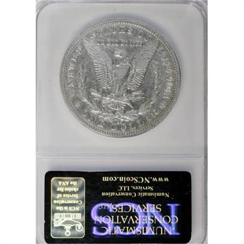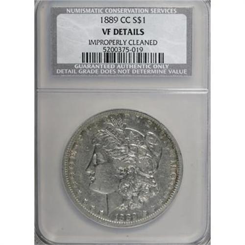 <B>1889-CC $1 --Improperly Cleaned--NCS. VF Details.</B></I> This rare date Carson City dollar retains traces of mint luster, but the slate-gray surfaces are subdued from dipping. Glimpses of golden-brown have returned to the borders.<BR><BR><B>Coin Engraver:</B> George T. Morgan<BR><BR><b>Shipping:</b> Coins & Currency (<a target="_blank" href="http://www.heritageauctions.com/common/shipping.php">view shipping information</a>)
