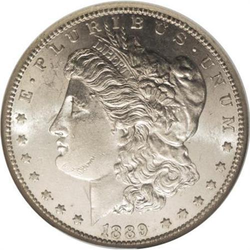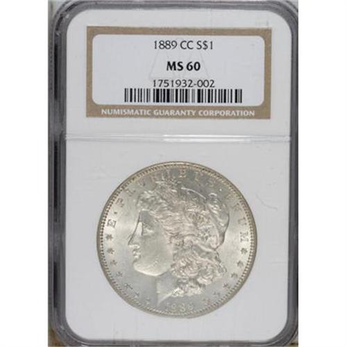 <B>1889-CC $1 MS60 NGC.</B></I> According to Q. David Bowers (1993): "Nearly all 1889-CC dollars are well struck with excellent definition of details." The current offering is no exception, as crisp definition appears over each side, including the hair detail just above Liberty's ear and the eagle's breast feathers. The piece displays excellent cartwheel luster indicative of a Mint State coin, and the shining silver-white surfaces are untoned. What appears to be a faint grease streak rests beneath US in PLURIBUS. A few minor nicks and blemishes occur on each side, but a moderate milling mark on Liberty's jaw area is the most obvious grade-limiter. The 1889-CC is, of course, the scarcest of all Carson City silver dollars, and an important key date in the Morgan dollar series. <BR><BR><b>Shipping:</b> Coins & Currency (<a target="_blank" href="http://www.heritageauctions.com/common/shipping.php">view shipping information</a>)