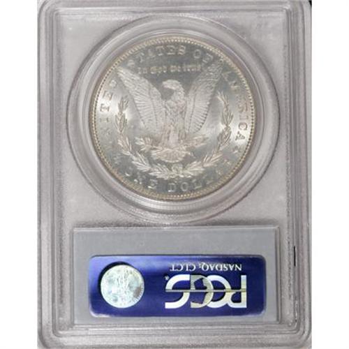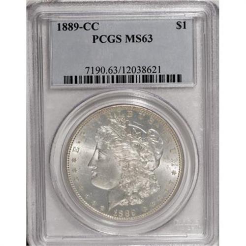 <B>1889-CC $1 MS63 PCGS.</B></I> It is the rarest and most desirable Carson City Morgan dollar coined from 1878 to 1893. The 1889-CC is seldom found in any Mint State grade, and even XF and AU coins are elusive. Only 350,000 were struck in the last three months of the year, and nearly every one of those coins entered circulation. Despite occasional rumors of a single bag of 1,000 Mint State coins that may still exist, no hoards of this date have ever surfaced. In the early and middle 20th century, small groups appeared from time to time, and those groups were normally only a roll at a time. The appearance of such individual rolls of Mint State coins from the 1930s to the 1950s is apparently the source of all such pieces that exist today.<BR> Writing in a <I>Guide Book of Morgan Silver Dollars, </B></I>Q. David Bowers considers MS63 to be the optimal collecting grade for this issue. We agree with that thought, but disagree with his estimated population of surviving pieces. Bowers suggests that as many as 9,000 Mint State 1889-CC Morgan dollars still exist, a figure that we consider substantially high.<BR> This lovely piece has satiny silver luster with full white brilliance on both sides. A few tiny surface marks are consistent with the grade, and most evident on the obverse. The design motifs are sharp and fully defined, included complete hair over Liberty's ear and full breast feathers. Population: 68 in 63, 31 finer (1/08).<BR><I>From The Oxford Collection.</B></I><BR><BR><B>Coin Engraver:</B> George T. Morgan<BR><BR><b>Shipping:</b> Coins & Currency (<a target="_blank" href="http://www.heritageauctions.com/common/shipping.php">view shipping information</a>)